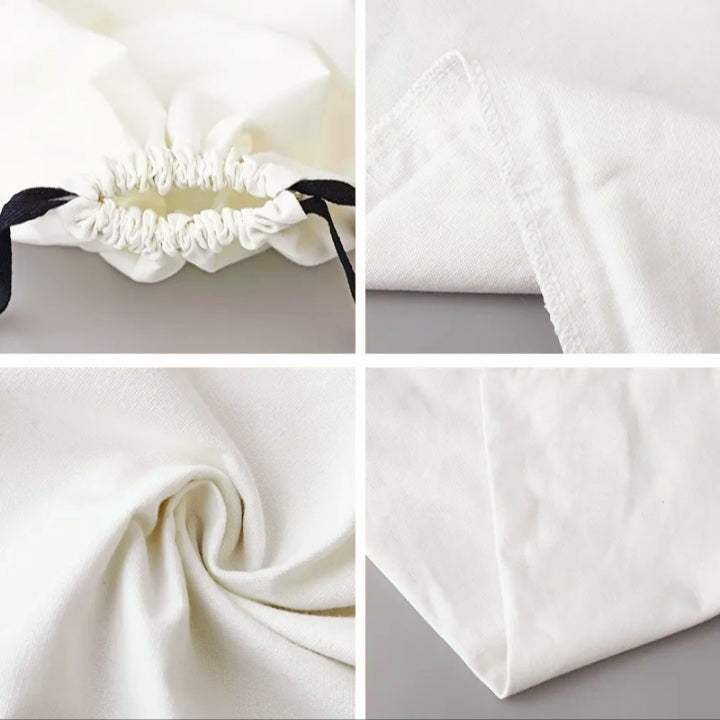 Cool white canvas shoe case with black drawstring. 1 cases holds a pair of shoes. Unless you want to purchases 2, if you're packing xtra large shoes.